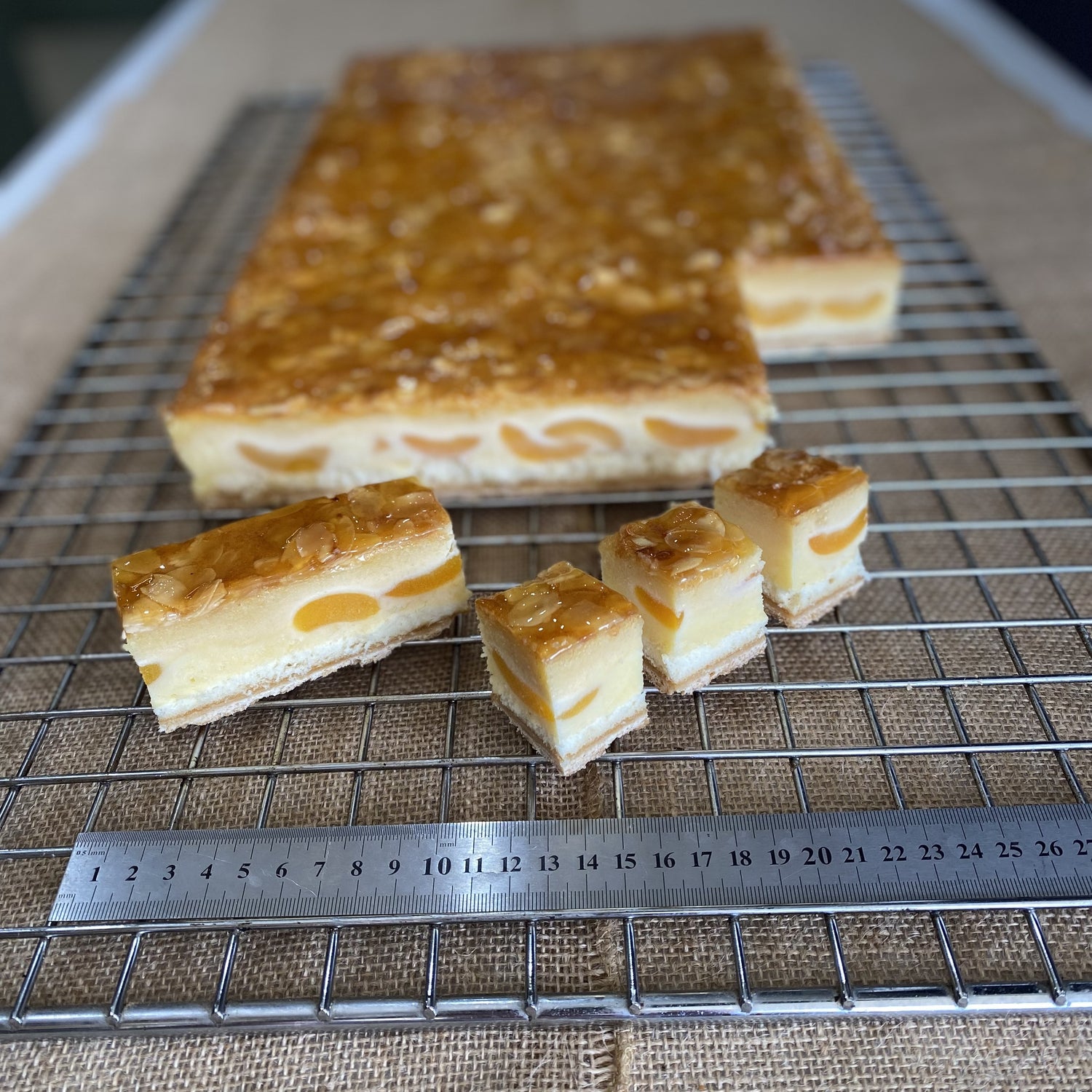 Our slab size cakes can be portioned to whatever size is most useful. From a slice that is suitable for an individual dessert to portioned cocktail size for a high tea or cocktail platter. Shipped frozen in our wholesale cardboard boxes, our slabs are 30cm by 48cm. You can decide what size suits you.